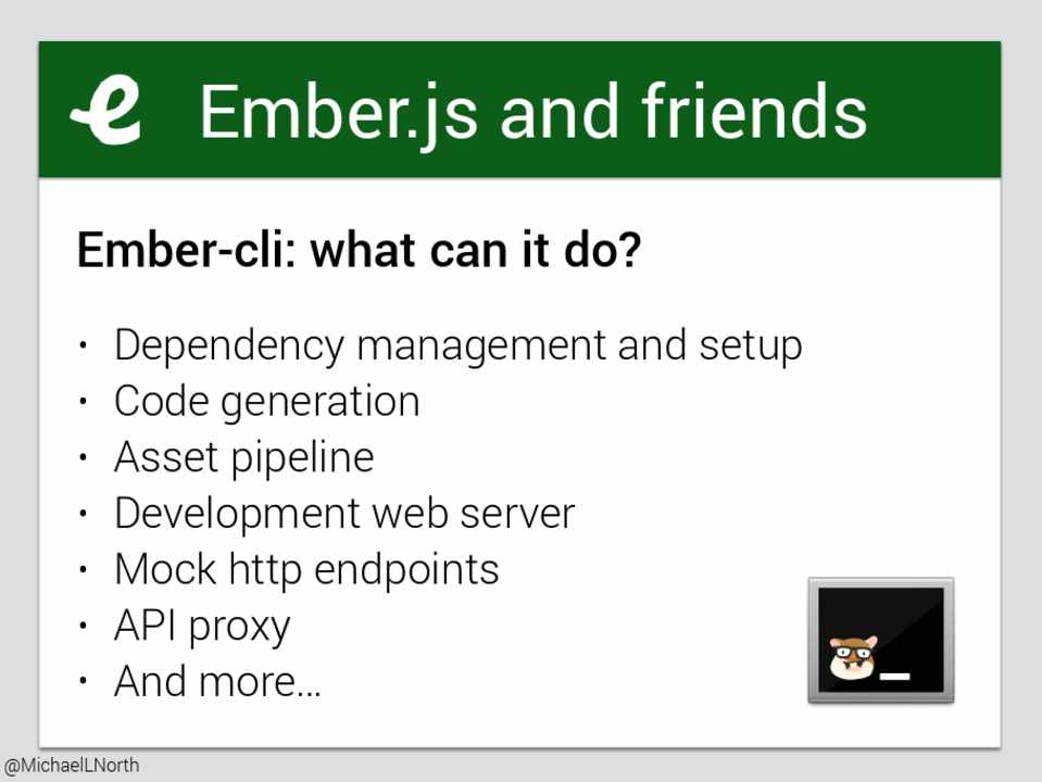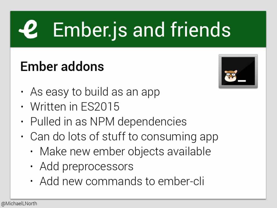 • Make new ember objects available • Add preprocessors • Add new commands to ember-cli