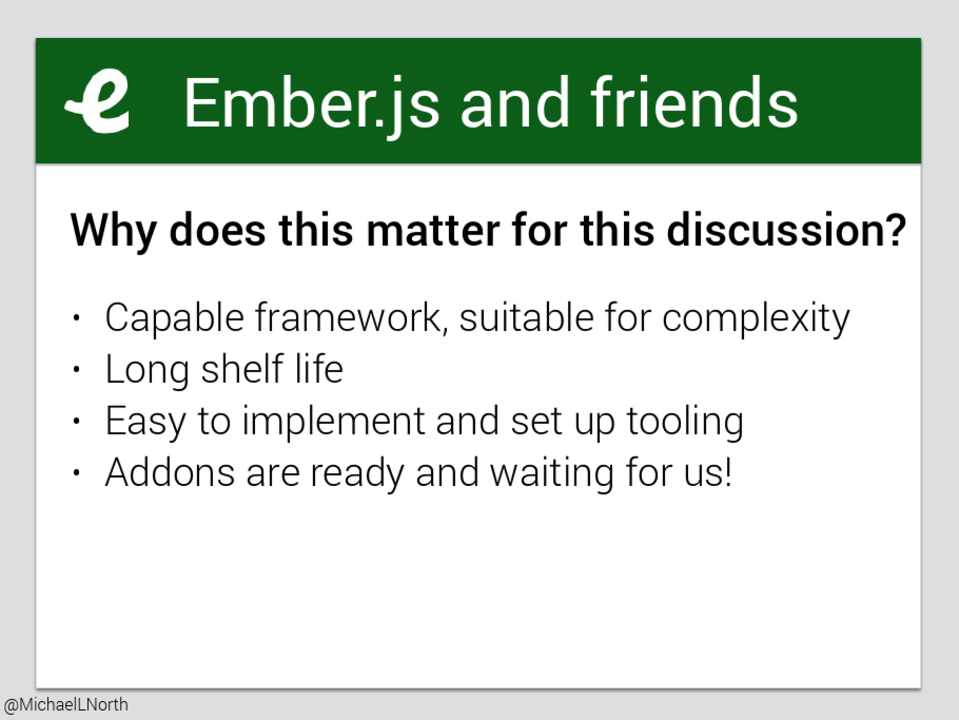 • Capable framework, suitable for complexity • Long shelf life • Easy to implement and set up tooling • Addons are ready and waiting for us!