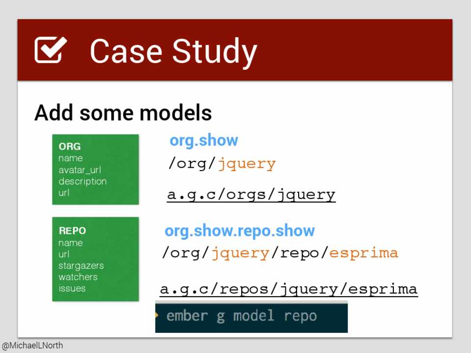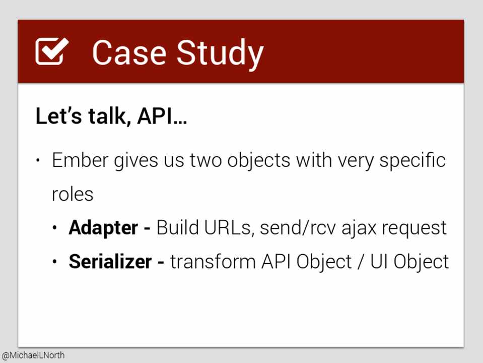 • Ember gives us two objects with very specific roles • Adapter - Build URLs, send/rcv ajax request • Serializer - transform API Object / UI Object