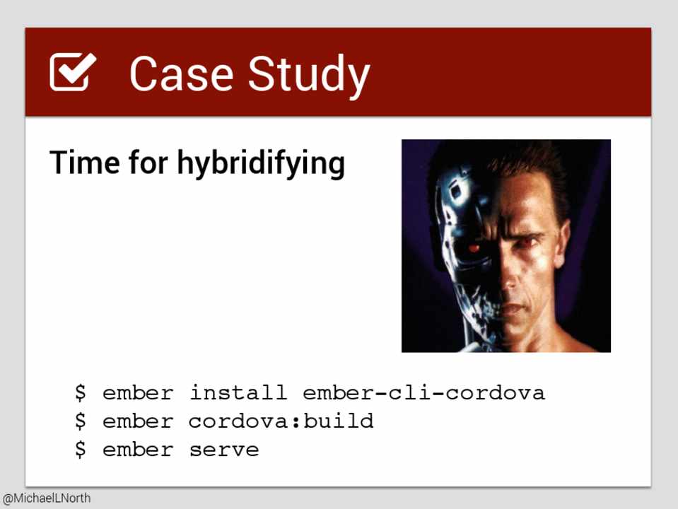 $ ember install ember-cli-cordova $ ember cordova:build $ ember serve