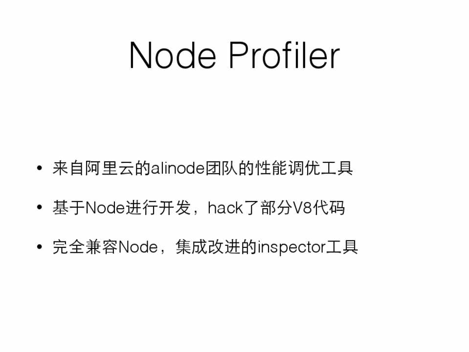 • 来⾃自阿⾥里云的alinode团队的性能调优⼯工具 • 基于Node进⾏行开发,hack了部分V8代码 • 完全兼容Node,集成改进的inspector⼯工具