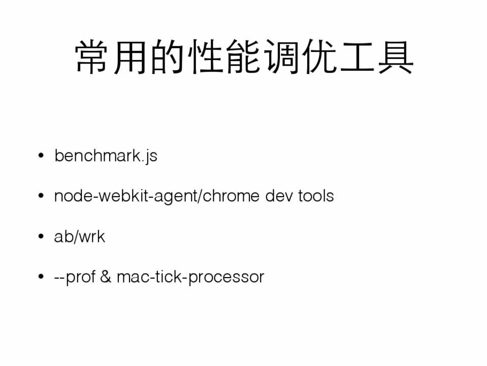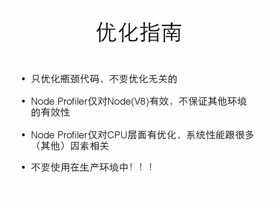 • 只优化瓶颈代码,不要优化⽆无关的 • Node Profiler仅对Node(V8)有效,不保证其他环境