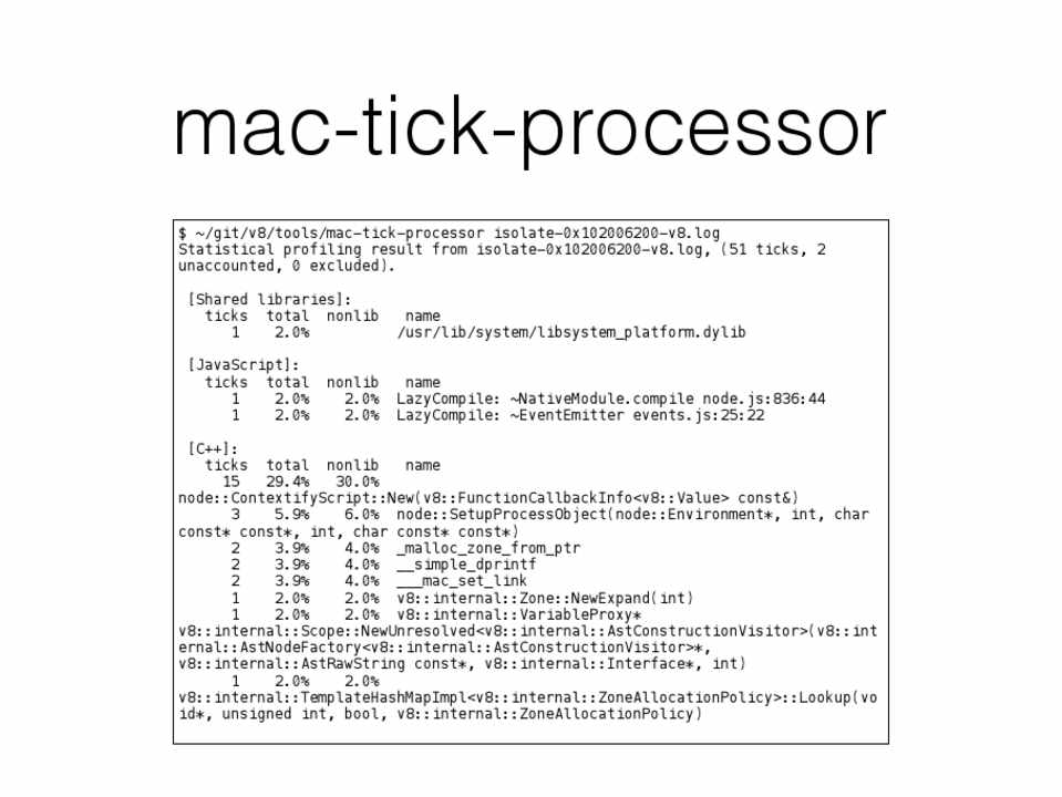 $ ~/git/v8/tools/mac-tick-processor isolate-0x102006200-v8.log Statistical profiling result from isolate-0x102006200-v8.log, (51 ticks, 2 unaccounted, 0 excluded).