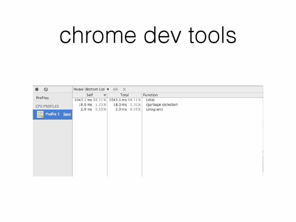• benchmark.js • node-webkit-agent/chrome dev tools • ab/wrk • --prof & mac-tick-processor