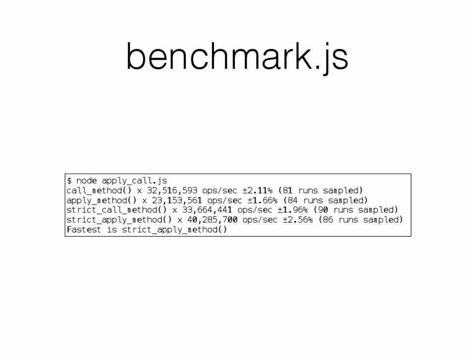 $ node apply_call.js call_method() x 32,516,593 ops/sec ±2.11% (81 runs sampled) apply_method() x 23,153,561 ops/sec ±1.66% (84 runs sampled) strict_call_method() x 33,664,441 ops/sec ±1.96% (90 runs sampled) strict_apply_method() x 40,285,700 ops/sec ±2.56% (86 runs sampled) Fastest is strict_apply_method()