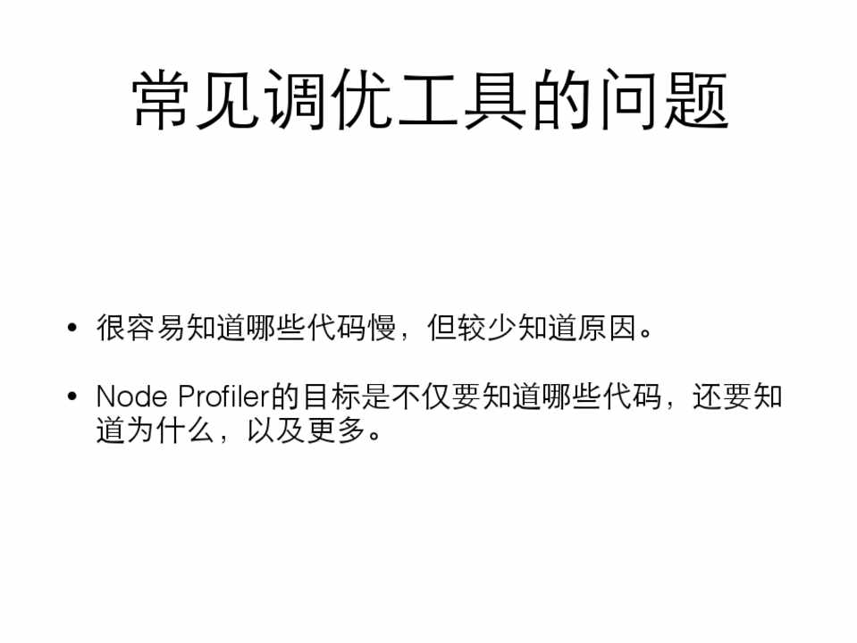 • 很容易知道哪些代码慢,但较少知道原因。 • Node Profiler的⺫⽬目标是不仅要知道哪些代码,还要知