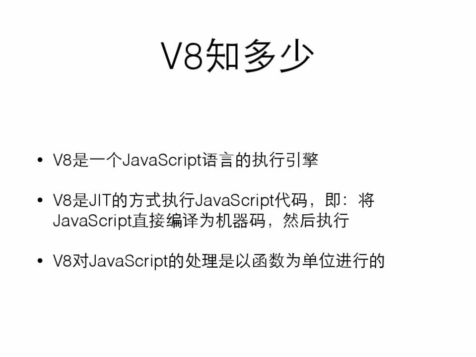 • V8是⼀一个JavaScript语⾔言的执⾏行引擎 • V8是JIT的⽅方式执⾏行JavaScript代码,即:将