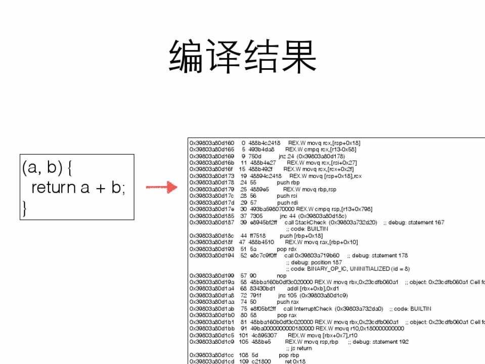 JavaScript直接编译为机器码,然后执⾏行 • V8对JavaScript的处理是以函数为单位进⾏行的