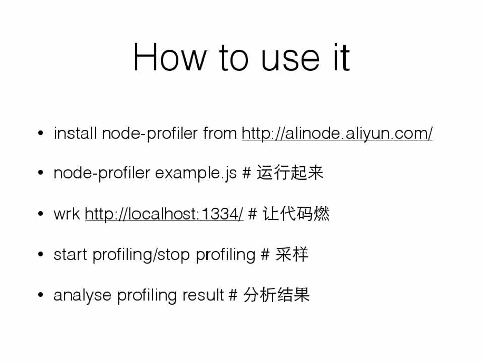 • install node-profiler from http://alinode.aliyun.com/ • node-profiler example.js # 运⾏行起来 • wrk http://localhost:1334/ # 让代码燃 • start profiling/stop profiling # 采样 • analyse profiling result # 分析结果
