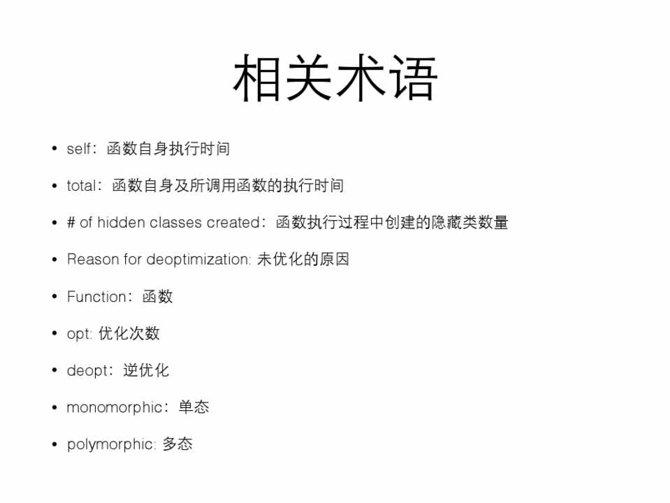 • self:函数⾃自⾝身执⾏行时间 • total:函数⾃自⾝身及所调⽤用函数的执⾏行时间 • # of hidden classes created:函数执⾏行过程中创建的隐藏类数量 • Reason for deoptimization: 未优化的原因 • Function:函数 • opt: 优化次数 • deopt:逆优化 • monomorphic:单态 • polymorphic: 多态