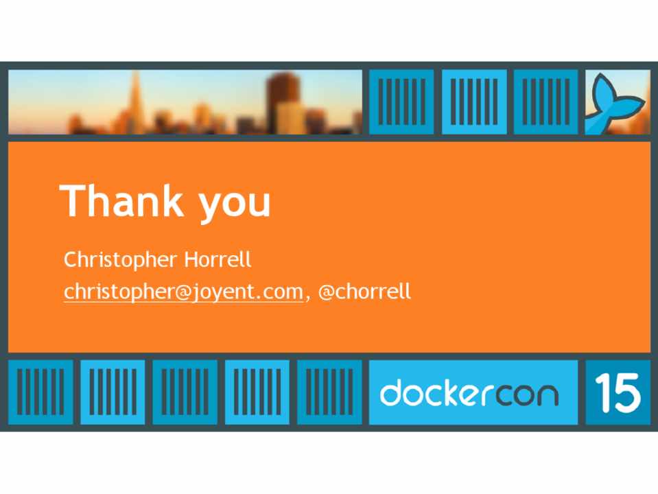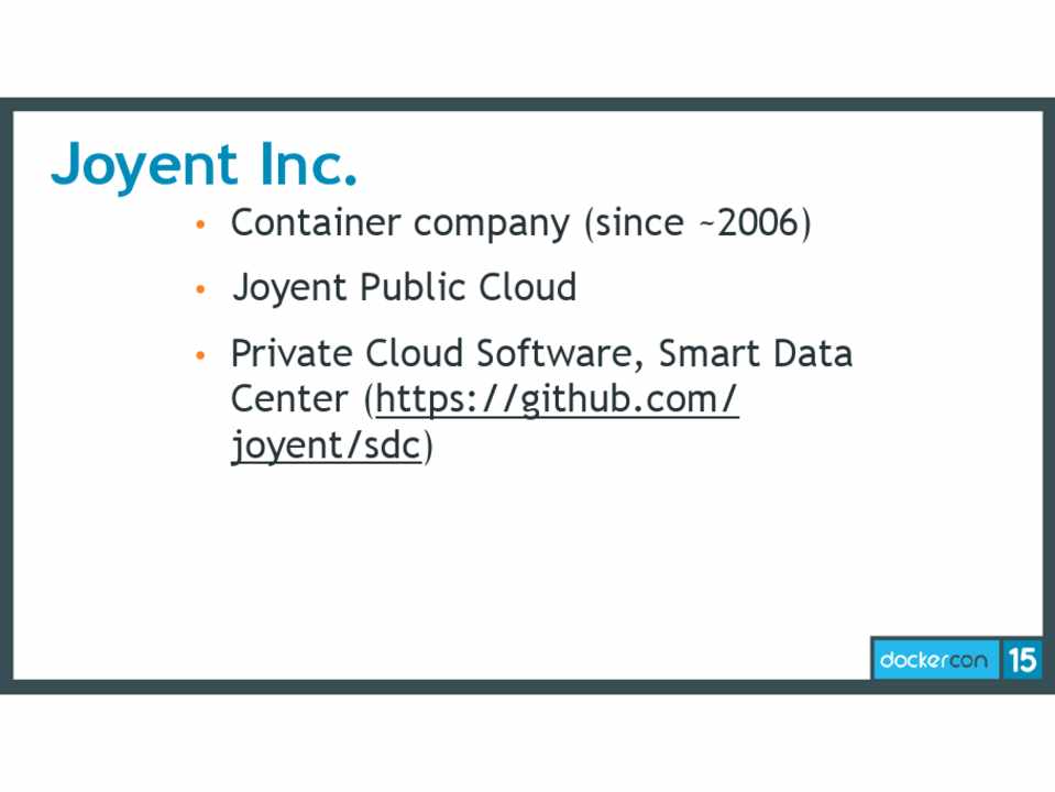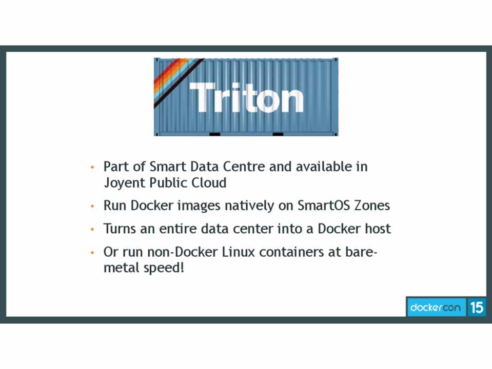 • Run Docker images natively on SmartOS Zones • Turns an entire data center into a Docker host • Or run non-Docker Linux containers at bare-