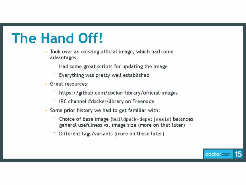 • Some prior history we had to get familiar with: - Choice of base image (buildpack-deps:jessie) balances general usefulness vs. image size (more on that later) - Different tags/variants (more on those later)