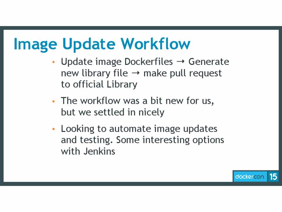 • Looking to automate image updates and testing. Some interesting options with Jenkins