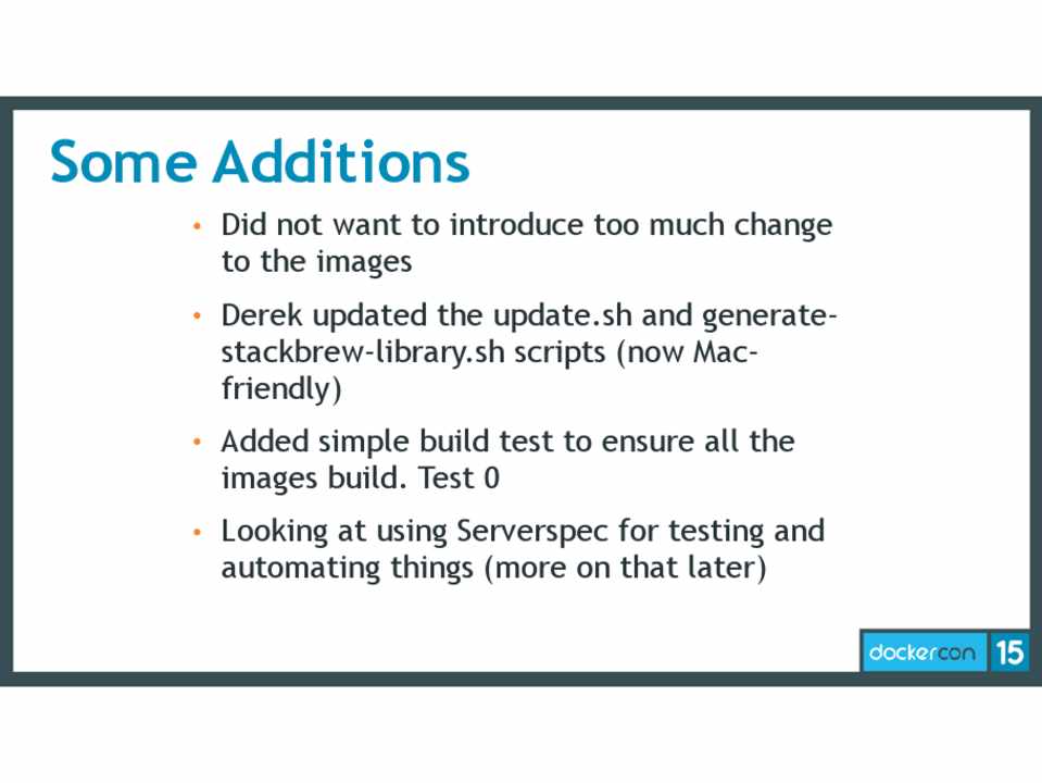 • We had the benefit of taking over an established image which follows Docker best practices