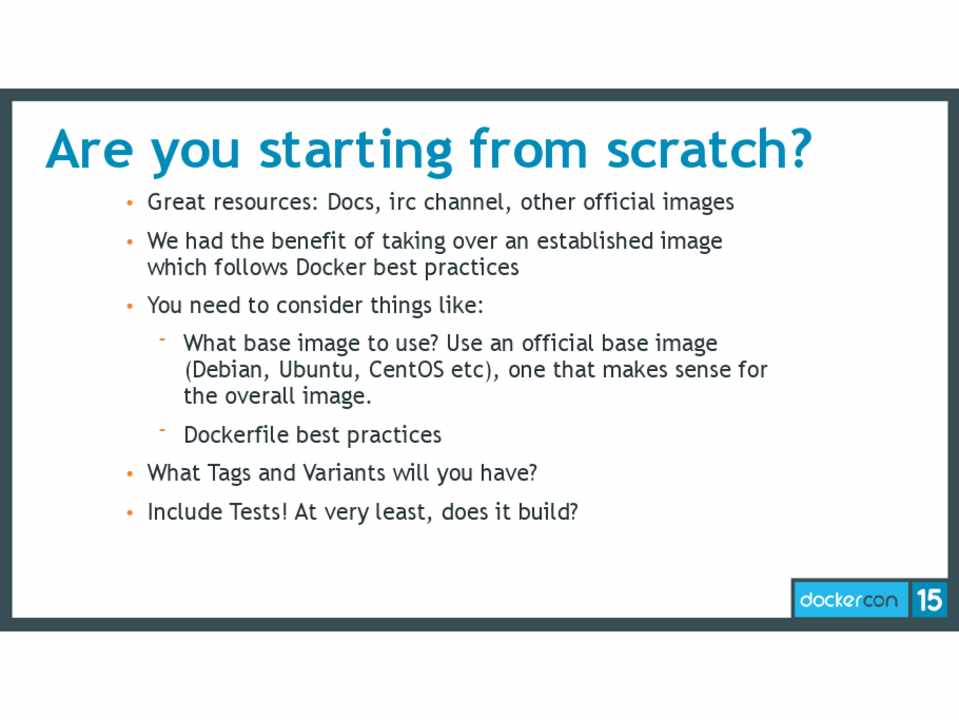 • You need to consider things like: - What base image to use? Use an official base image (Debian, Ubuntu, CentOS etc), one that makes sense for the overall image. - Dockerfile best practices