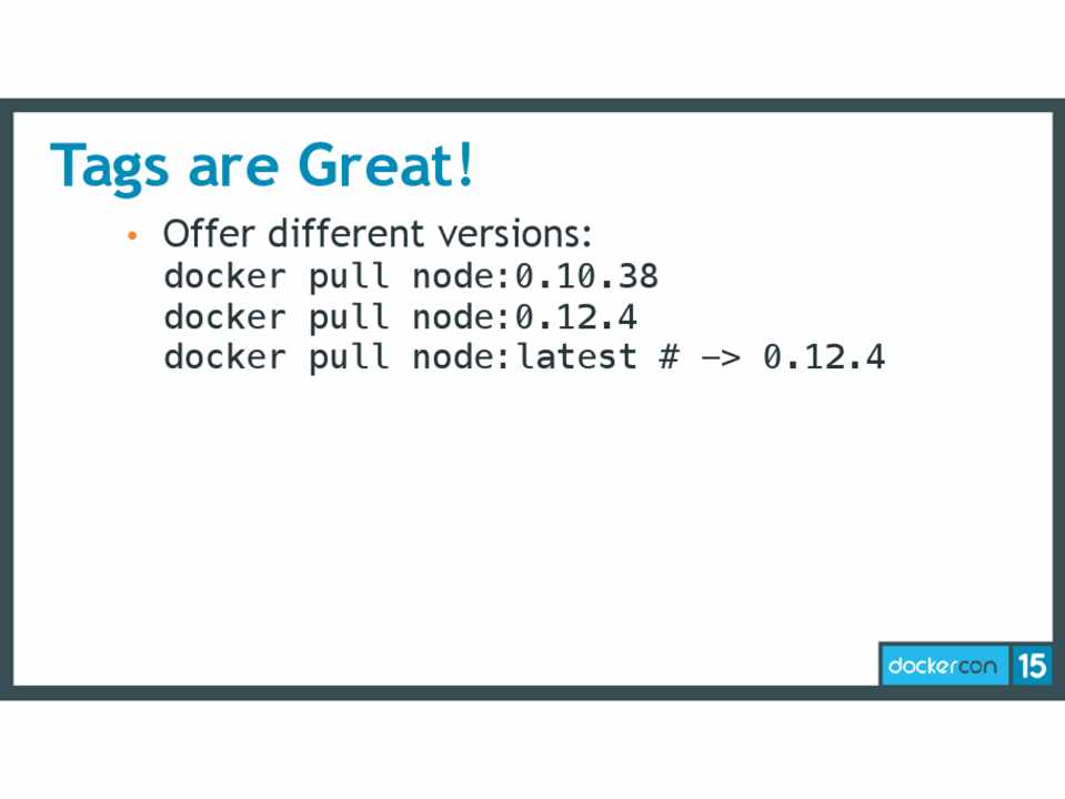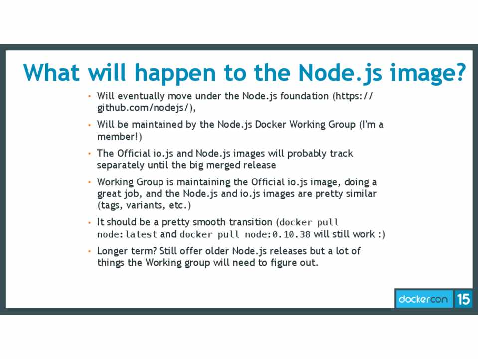 • It should be a pretty smooth transition (docker pull node:latest and docker pull node:0.10.38 will still work :)