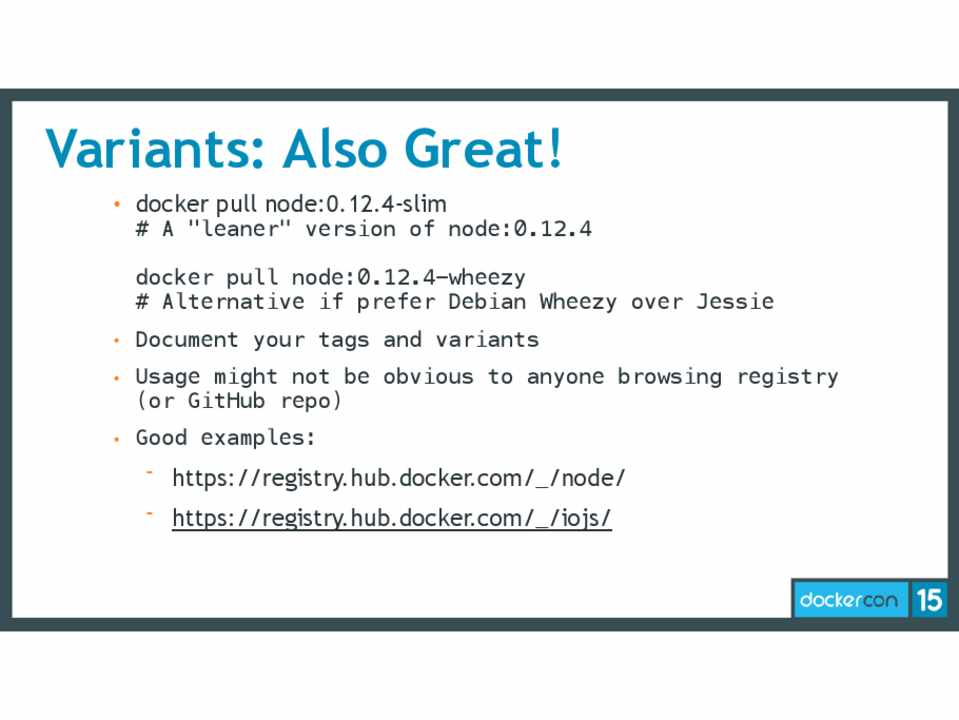 # A "leaner" version of node:0.12.4  docker pull node:0.12.4-wheezy # Alternative if prefer Debian Wheezy over Jessie