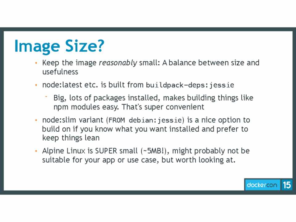 • node:slim variant (FROM debian:jessie) is a nice option to build on if you know what you want installed and prefer to keep things lean