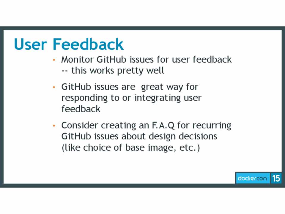 • Monitor GitHub issues for user feedback -- this works pretty well