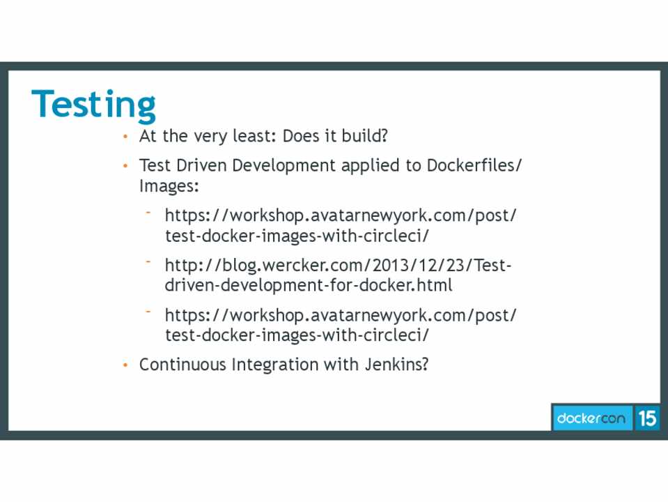 • Test Driven Development applied to Dockerfiles/ Images: - https://workshop.avatarnewyork.com/post/ test-docker-images-with-circleci/ - http://blog.wercker.com/2013/12/23/Testdriven-development-for-docker.html - https://workshop.avatarnewyork.com/post/ test-docker-images-with-circleci/