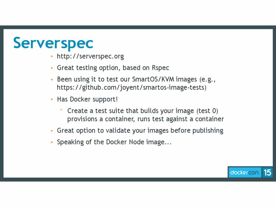 • Has Docker support! - Create a test suite that builds your image (test 0) provisions a container, runs test against a container