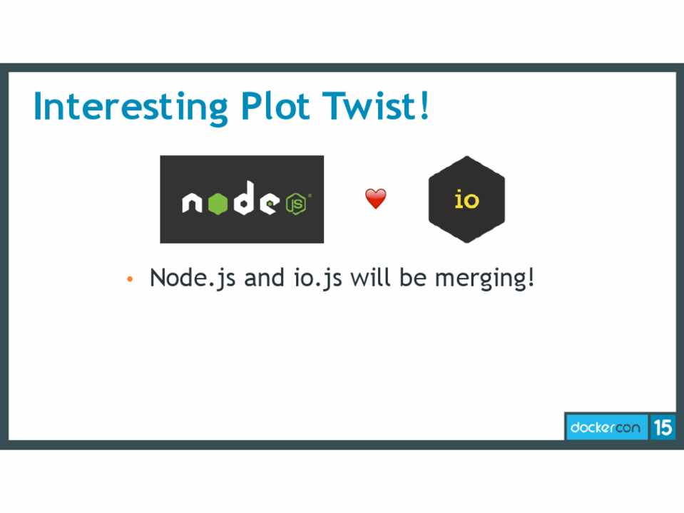 • The Official io.js and Node.js images will probably track separately until the big merged release