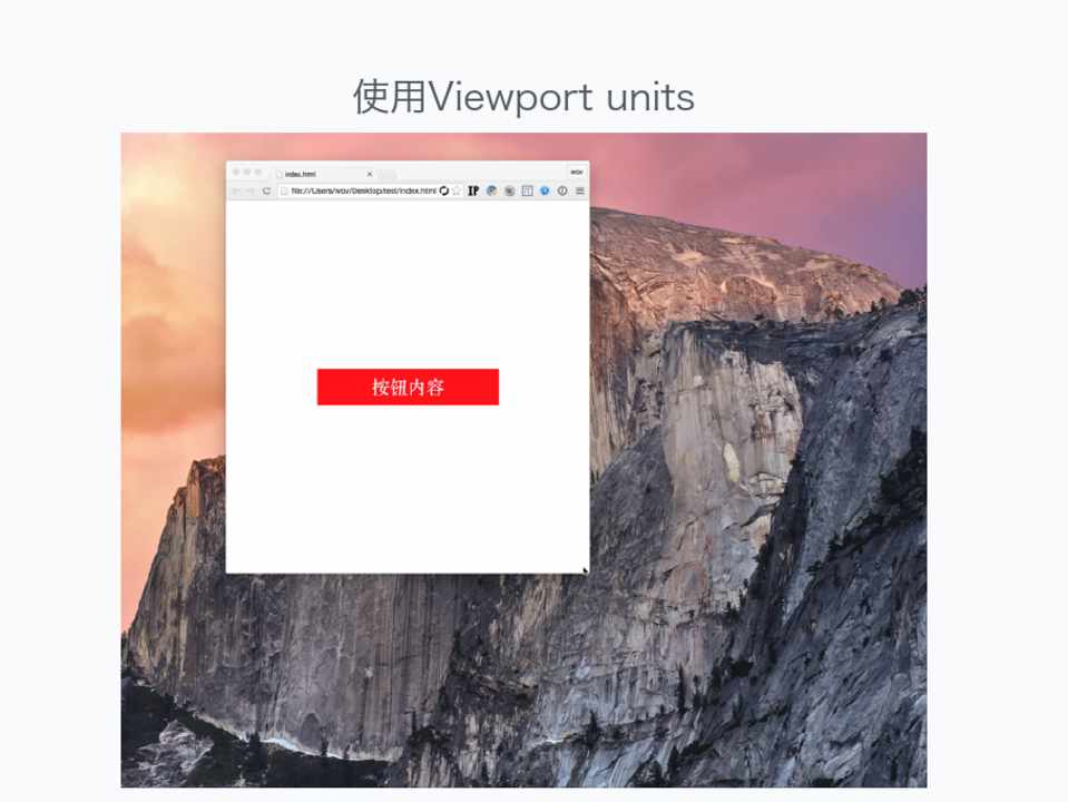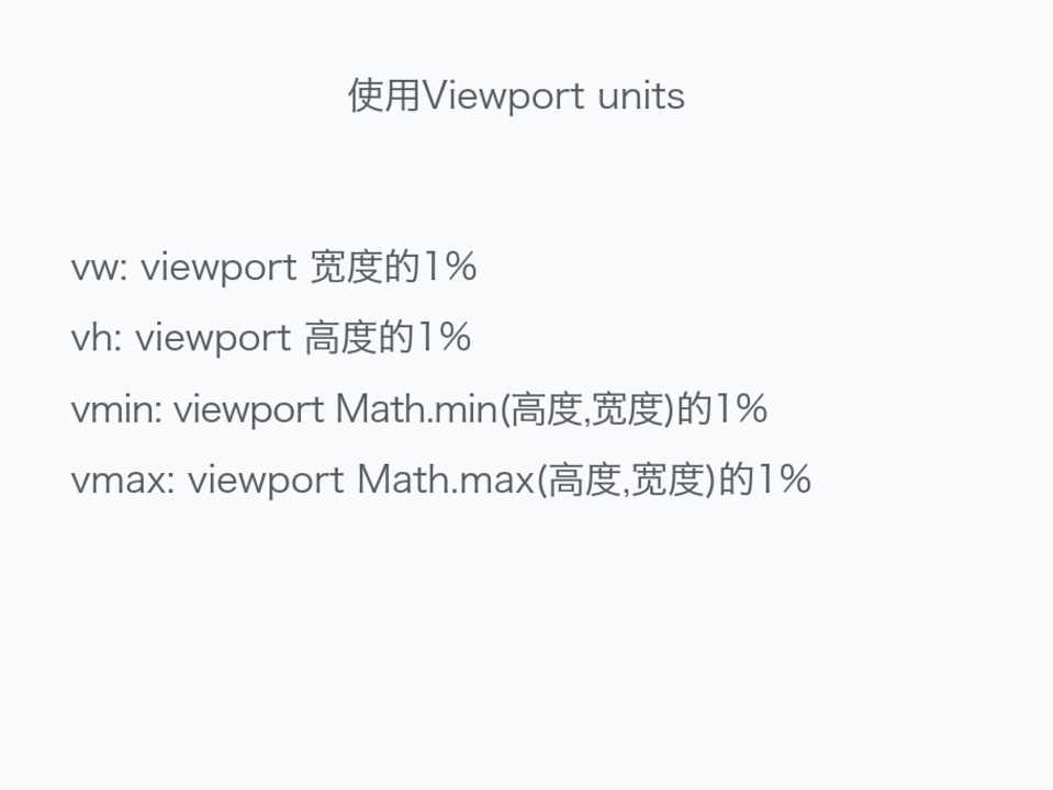 vw: viewport 宽度的1% vh: viewport 高度的1% vmin: viewport Math.min(高度,宽度)的1% vmax: viewport Math.max(高度,宽度)的1%