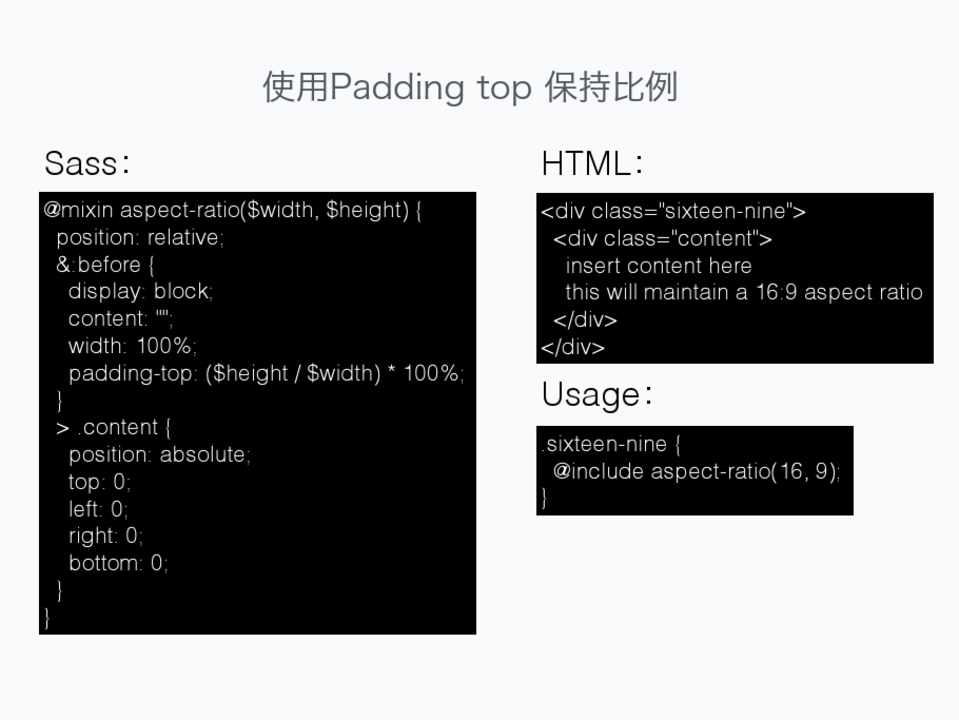 @mixin aspect-ratio($width, $height) { position: relative; &:before { display: block; content: ""; width: 100%; padding-top: ($height / $width) * 100%; } > .content { position: absolute; top: 0; left: 0; right: 0; bottom: 0; }