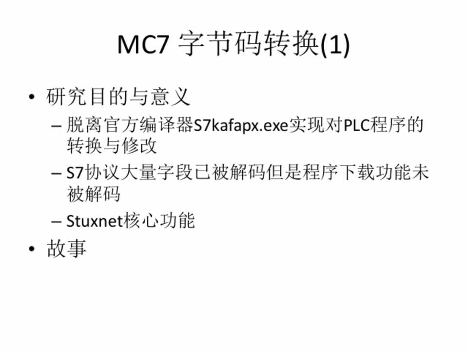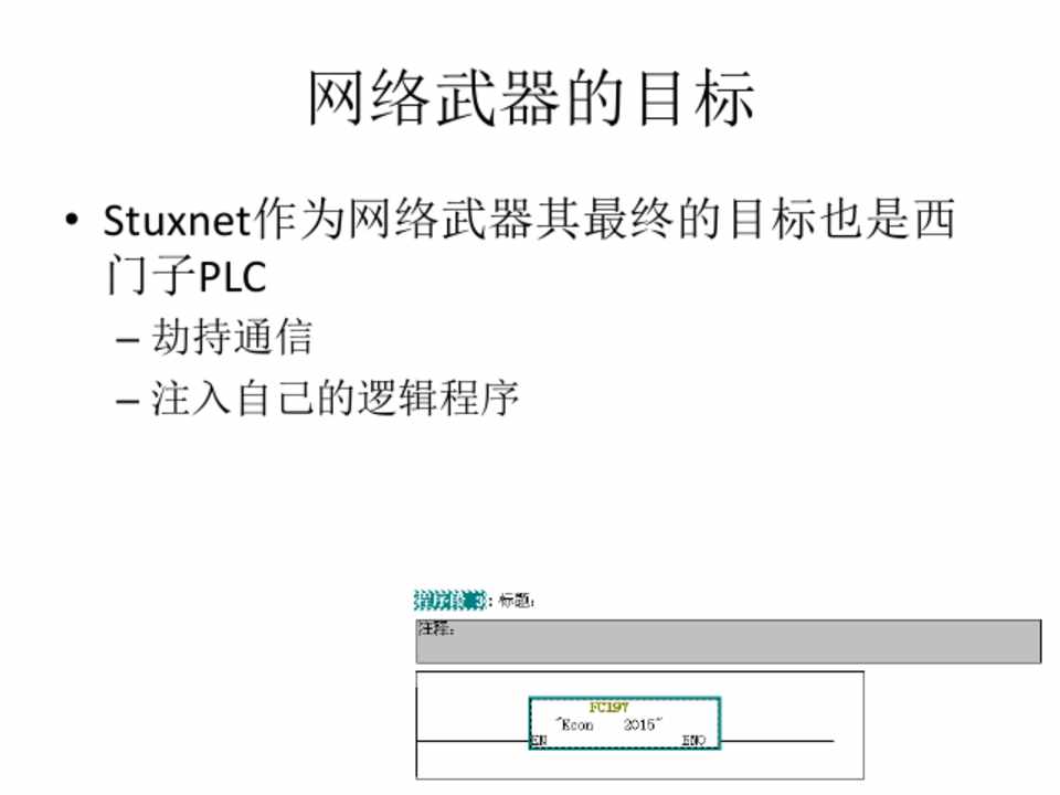• Stuxnet作为网络武器其最终的目标也是西 门子PLC