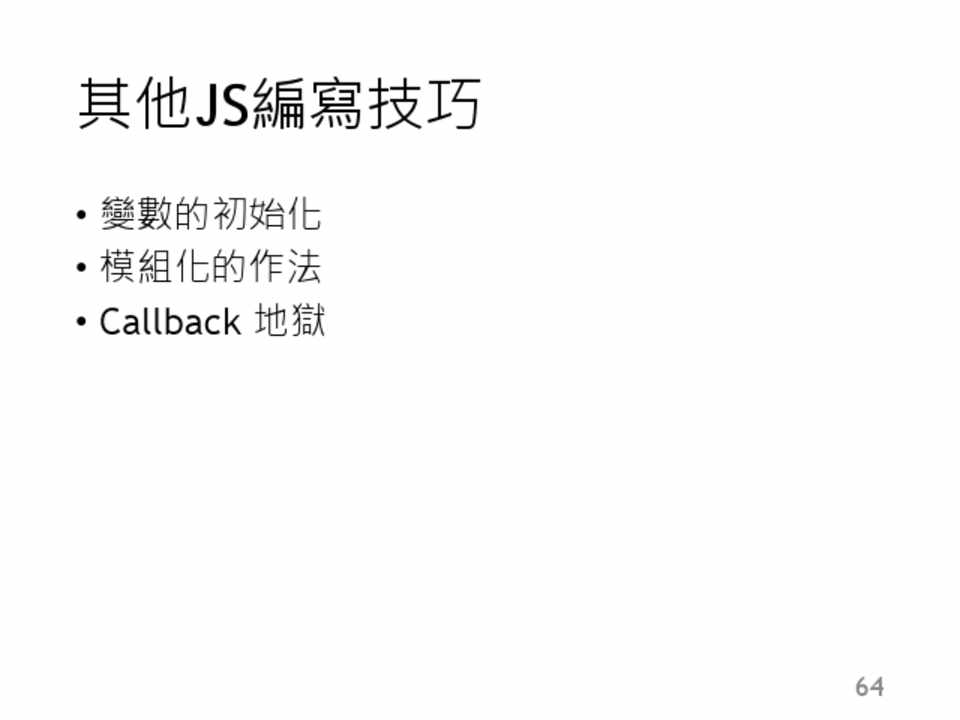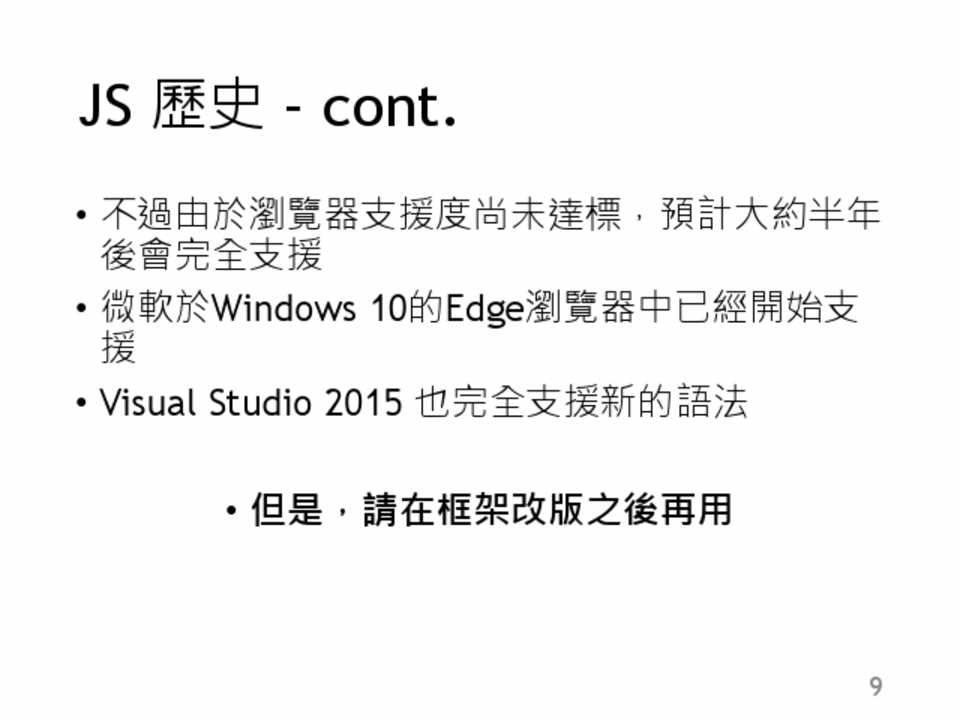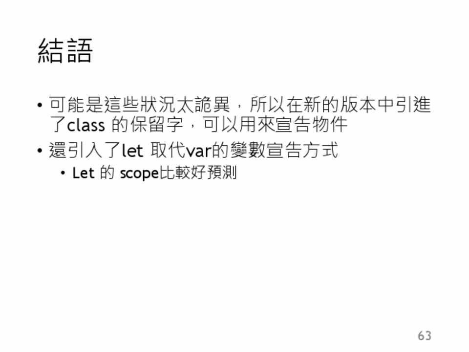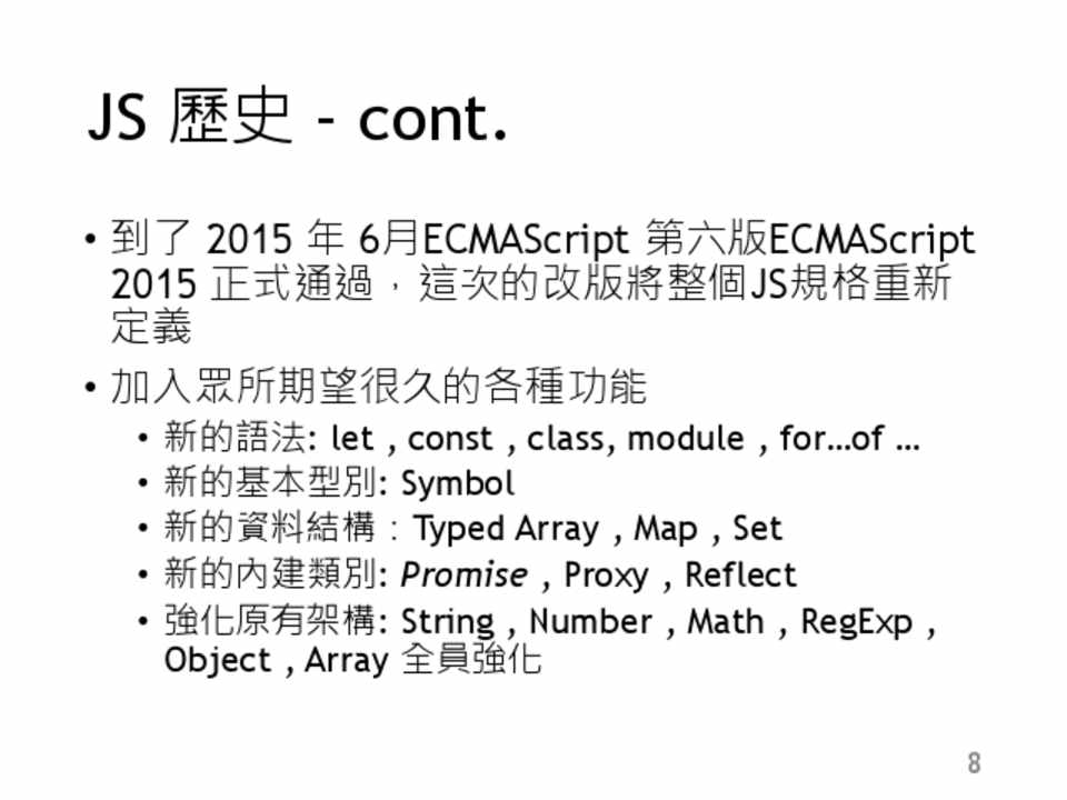 • 新的語法: let , const , class, module , for…of … • 新的基本型別: Symbol • 新的資料結構:Typed Array , Map , Set • 新的內建類別: Promise , Proxy , Reflect • 強化原有架構: String , Number , Math , RegExp ,