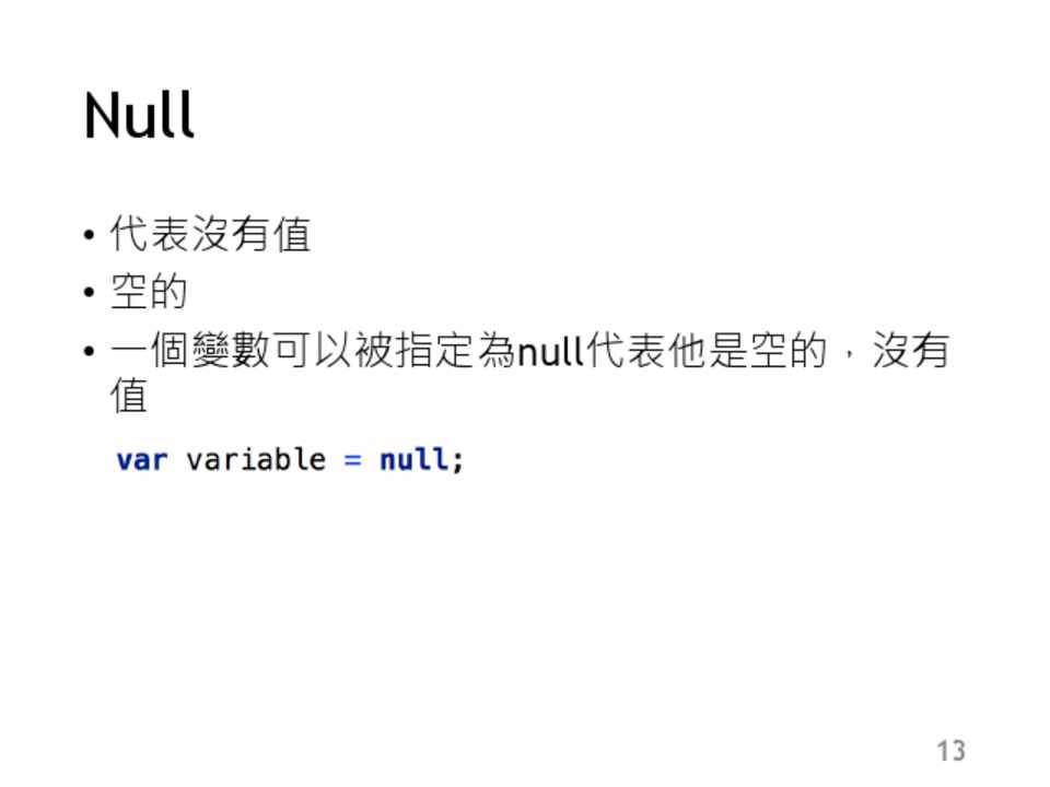 • 代表沒有值 • 空的 • 一個變數可以被指定為null代表他是空的,沒有