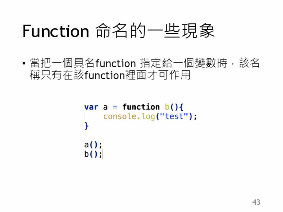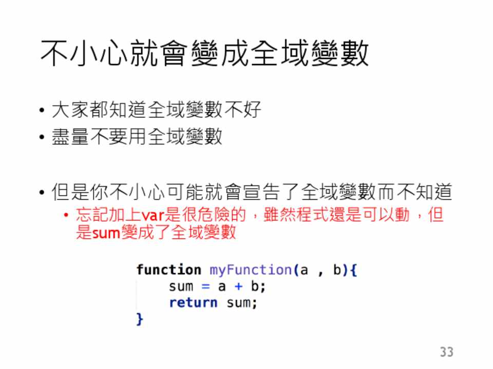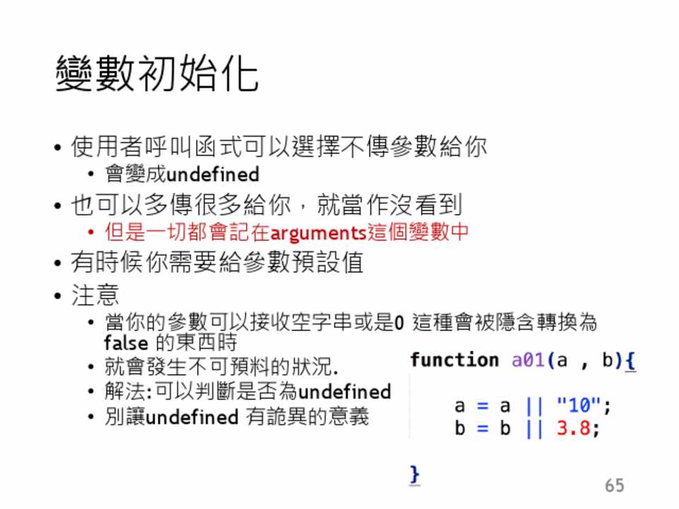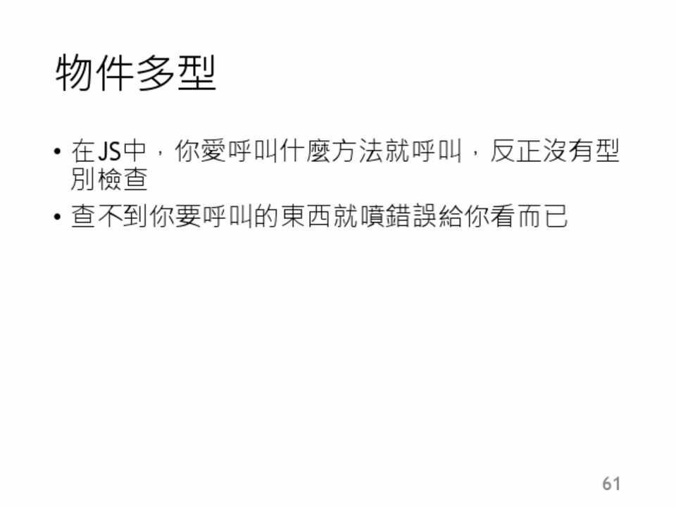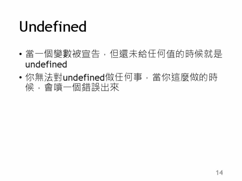 • 你無法對undefined做任何事,當你這麼做的時 候,會噴一個錯誤出來
