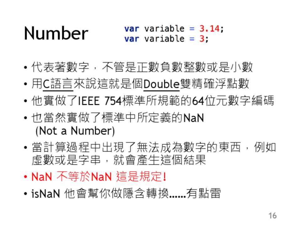 • 代表著數字,不管是正數負數整數或是小數 • 用C語言來說這就是個Double雙精確浮點數 • 他實做了IEEE 754標準所規範的64位元數字編碼 • 也當然實做了標準中所定義的NaN