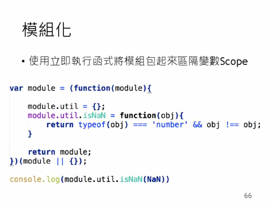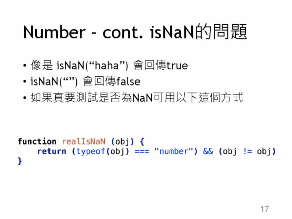 • 像是 isNaN(“haha”) 會回傳true • isNaN(“”) 會回傳false • 如果真要測試是否為NaN可用以下這個方式