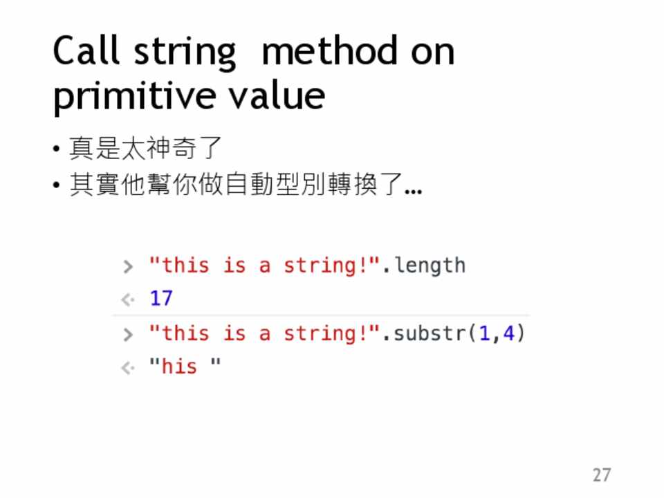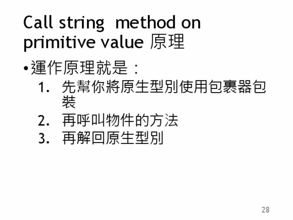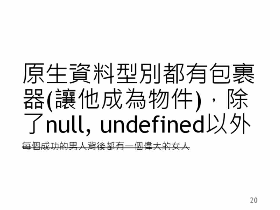 原生資料型別都有包裹 器(讓他成為物件),除 了null, undefined以外