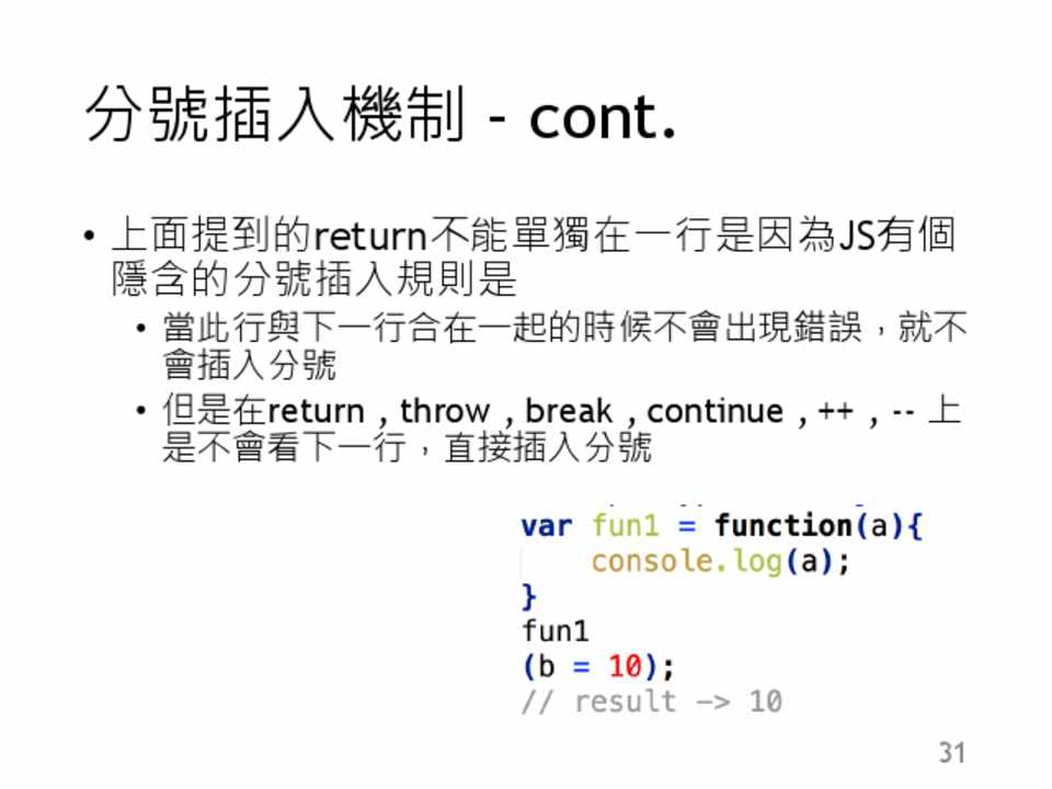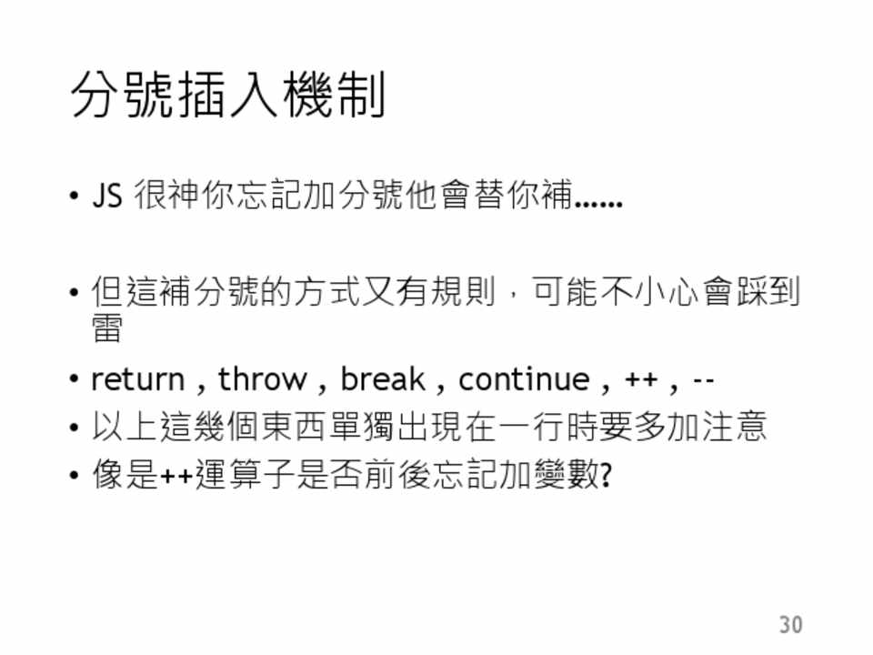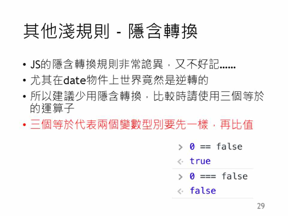 虛數或是字串,就會產生這個結果 • NaN 不等於NaN 這是規定! • isNaN 他會幫你做隱含轉換……有點雷