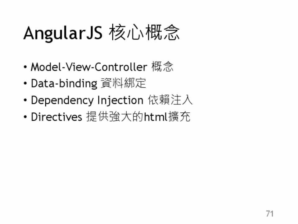 • Model-View-Controller 概念 • Data-binding 資料綁定 • Dependency Injection 依賴注入 • Directives 提供強大的html擴充