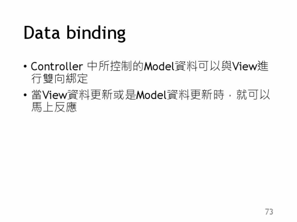 • Controller 中所控制的Model資料可以與View進 行雙向綁定