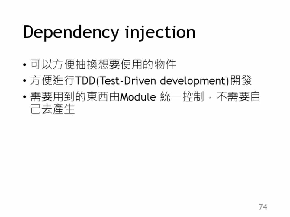• 可以方便抽換想要使用的物件 • 方便進行TDD(Test-Driven development)開發 • 需要用到的東西由Module 統一控制,不需要自