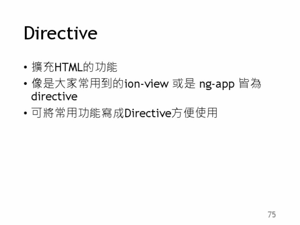 • 擴充HTML的功能 • 像是大家常用到的ion-view 或是 ng-app 皆為