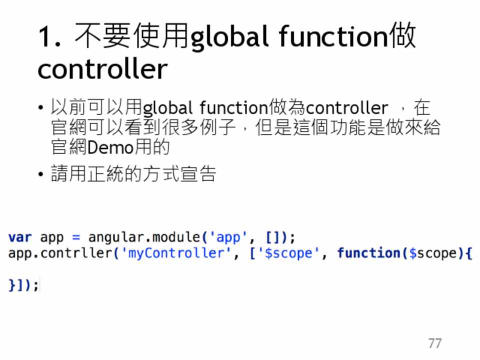 1. 不要使用global function做 controller