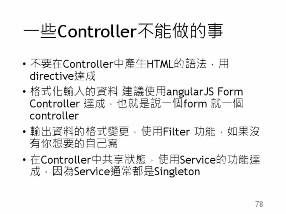• 不要在Controller中產生HTML的語法,用 directive達成