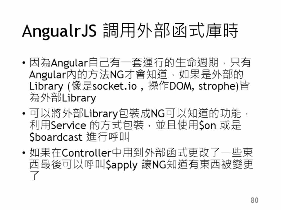• 因為Angular自己有一套運行的生命週期,只有 Angular內的方法NG才會知道,如果是外部的 Library (像是socket.io , 操作DOM, strophe)皆 為外部Library