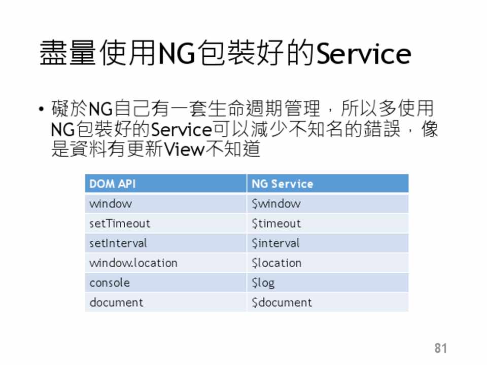 • 礙於NG自己有一套生命週期管理,所以多使用 NG包裝好的Service可以減少不知名的錯誤,像 是資料有更新View不知道