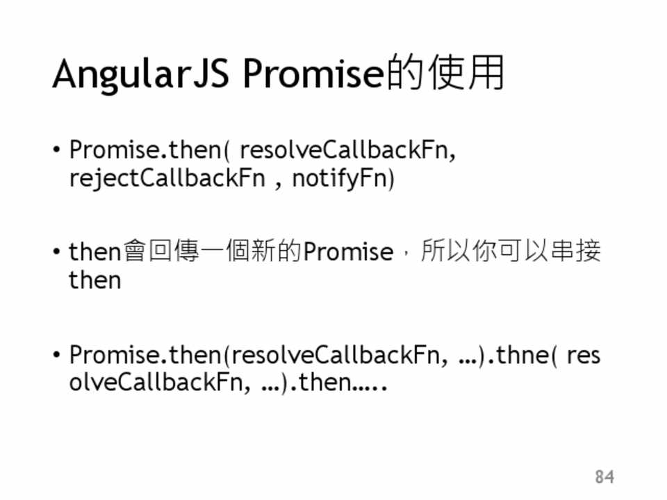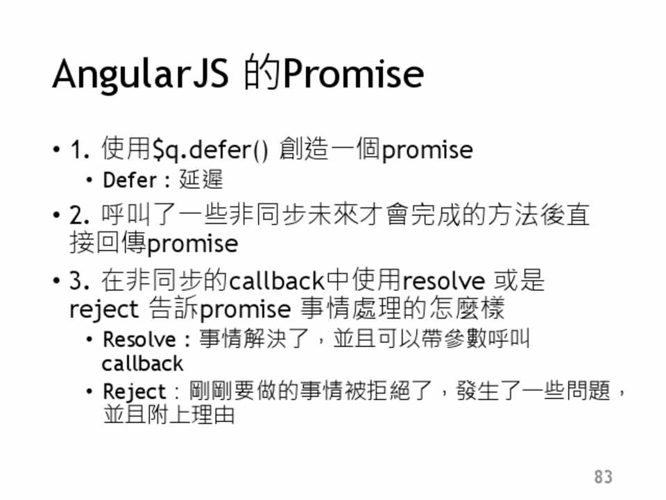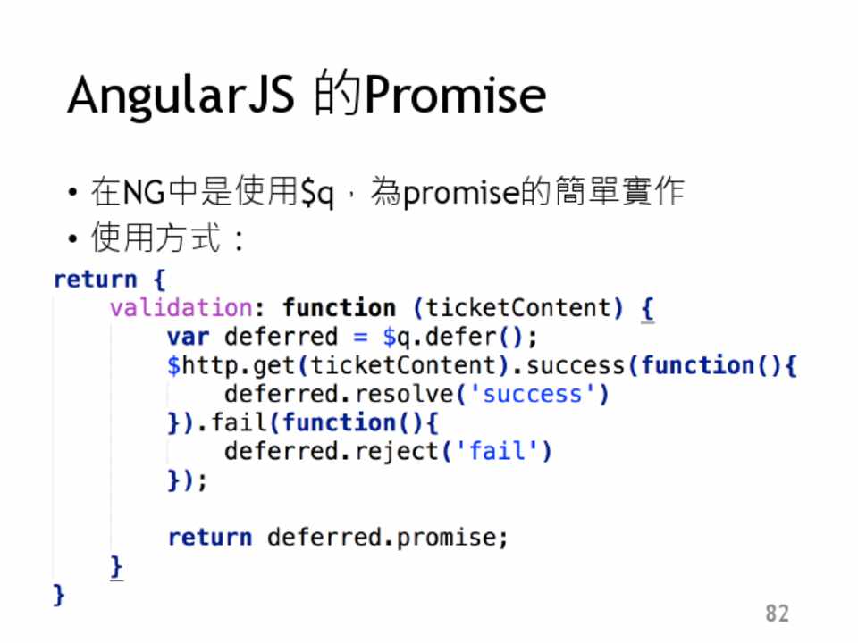 • 在NG中是使用$q,為promise的簡單實作 • 使用方式: