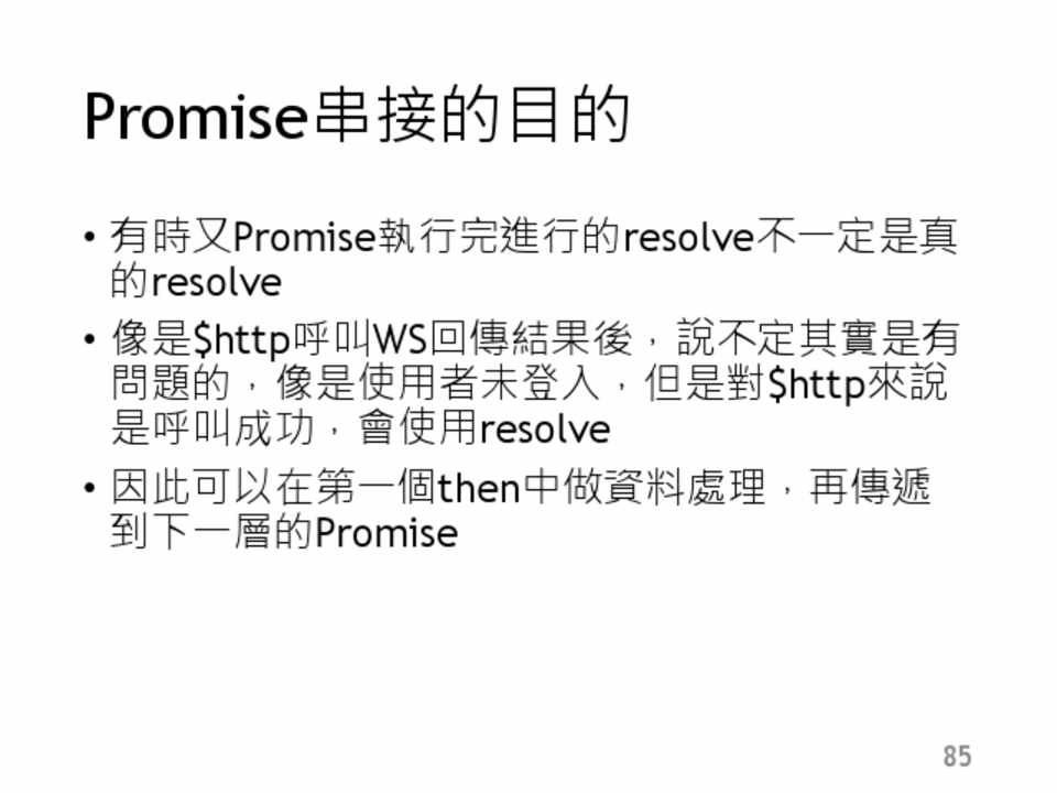 • 像是$http呼叫WS回傳結果後,說不定其實是有 問題的,像是使用者未登入,但是對$http來說 是呼叫成功,會使用resolve