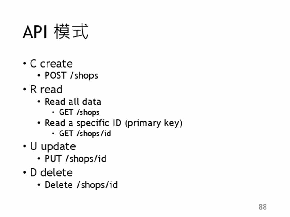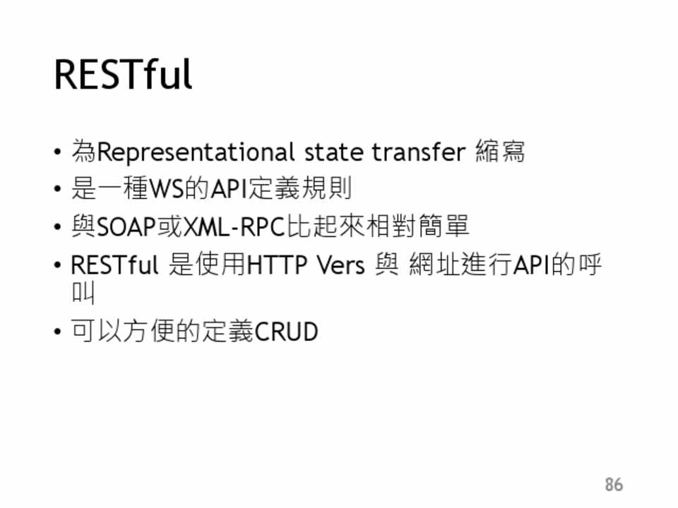 • 為Representational state transfer 縮寫 • 是一種WS的API定義規則 • 與SOAP或XML-RPC比起來相對簡單 • RESTful 是使用HTTP Vers 與 網址進行API的呼