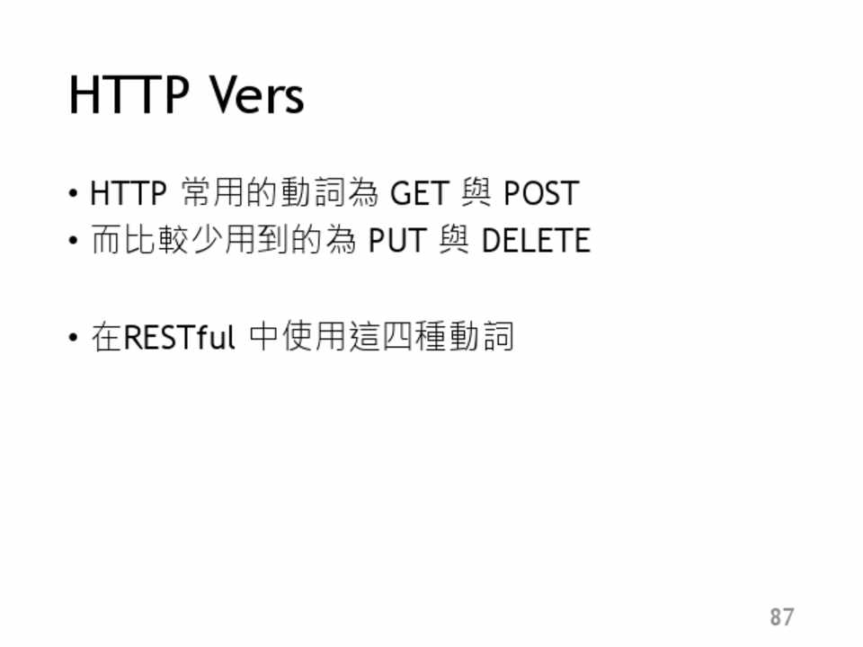 • HTTP 常用的動詞為 GET 與 POST • 而比較少用到的為 PUT 與 DELETE • 在RESTful 中使用這四種動詞