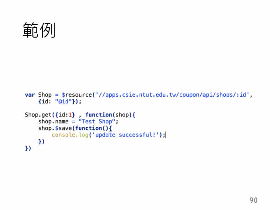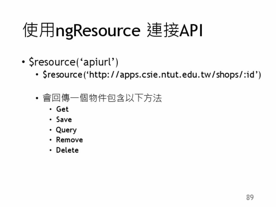 • $resource(‘http://apps.csie.ntut.edu.tw/shops/:id’)