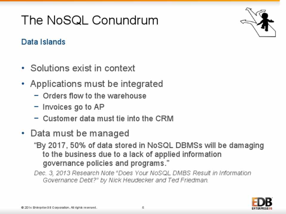 Dec. 3, 2013 Research Note “Does Your NoSQL DMBS Result in Information Governance Debt?” by Nick Heudecker and Ted Friedman.